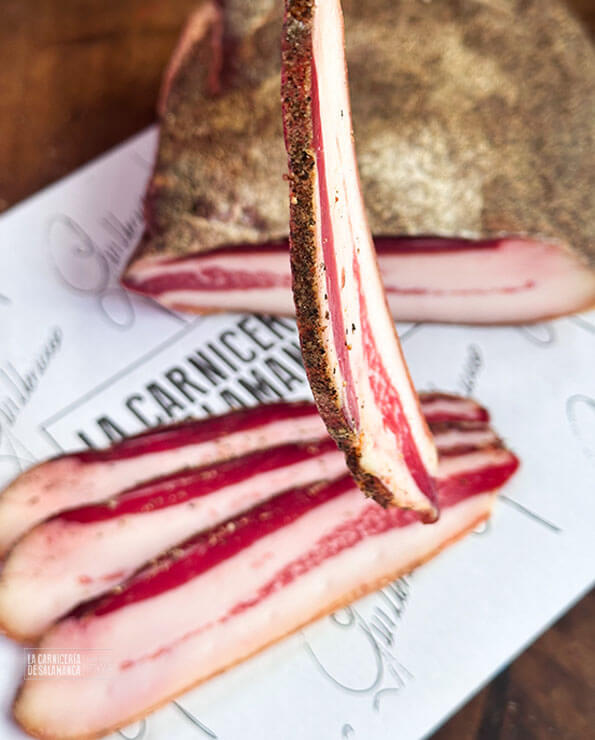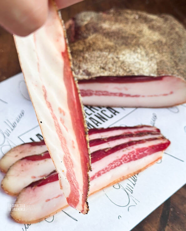 - Panceta curada: muy parecido al anterior pero con más parte magra y menos grasa. Al igual que la papada, está curada en pimentón.