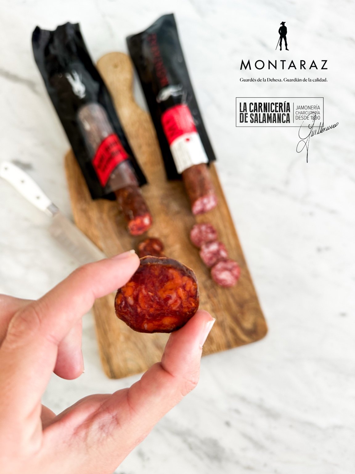 Es el formato fino del clásico salchichón o chorizo ibérico de toda la vida. Una pieza que ronda los 500 gramos y que se elabora con carne de cerdo ibérico, sin aditivos artificiales, con ingredientes naturales y curación lenta en secadero natural. Exactamente como se ha hecho siempre, pero con un nivel de excelencia que solo Montaraz sabe alcanzar.